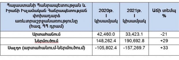 Ուշագրավ է, որ 2020 թվականի հունվար-հունիս ամիսներին Հայաստանիցհամախառն արտահանումն աճել է 23,3 տոկոսով, այն դեպքում, երբ մեզ սահմանակից երկիր՝ Իրան արտահանումը նվազել է 21 տոկոսով։ Դա կարող է բացատարվել Հայաստանից մետաղի ջարդոնի արտահանման արգելքով, Գորիս-Կապան ճանապարհահատվածի անվտանգային խնդիրներով, ատոմակայանի վերանորոգմամբ պայմանավորված էլեկտրաէներգիայի արտահանման նվազմամբ և այլն։