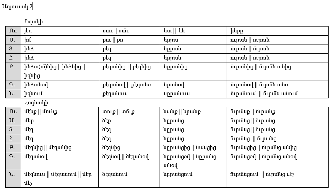Անձնական դերանունների գծապատկերը տե՛ս աղյուսակ 2-ում, ցուցական դերանունները՝ աղյուսակ 3-ում։