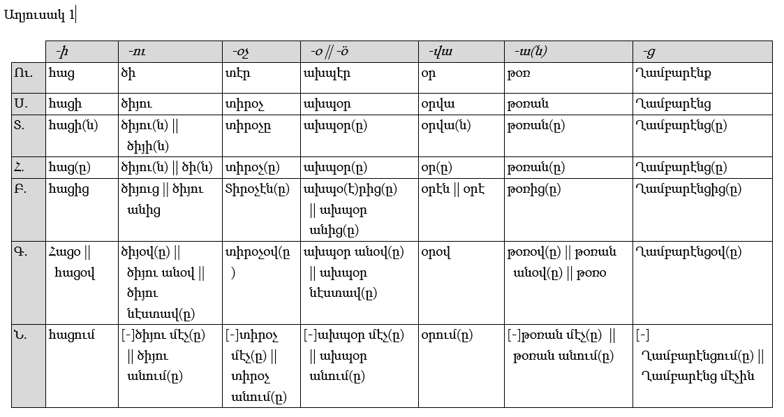ер, -нер, -ни и -к (-էր, -նէր, -նի) и (-ք).