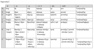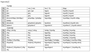 (-ի, -ու, -վա, -օչ, -ց, -օ || -օ̈, -ա(ն)). Вспомогательный глагол имеет следующий вид: настоящее